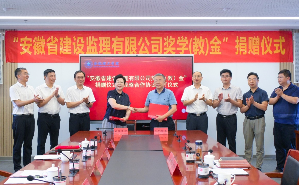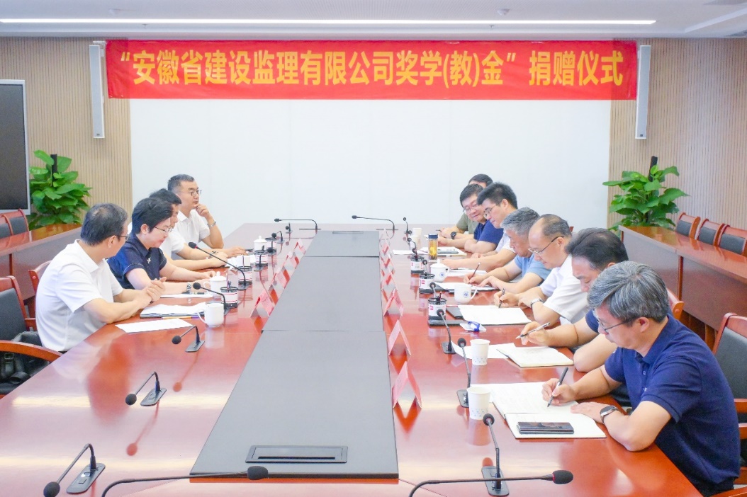 2025年9月17日,“安徽省建设监理有限公司奖学(教)金”捐赠暨校企战略合作协议签订仪式在pp电子行政综合楼第一会议室举行。校党委副书记、校长吴玉程,校筹备组副主任吴明在,安徽省建设监理有限公司(以下简称“安徽监理”)总经理朱仁芳、副总经理苏立新、副总经理陈永新、总经理助理王新闻出席捐赠和签约活动,仪式由校党委副书记、副校长李先强主持。