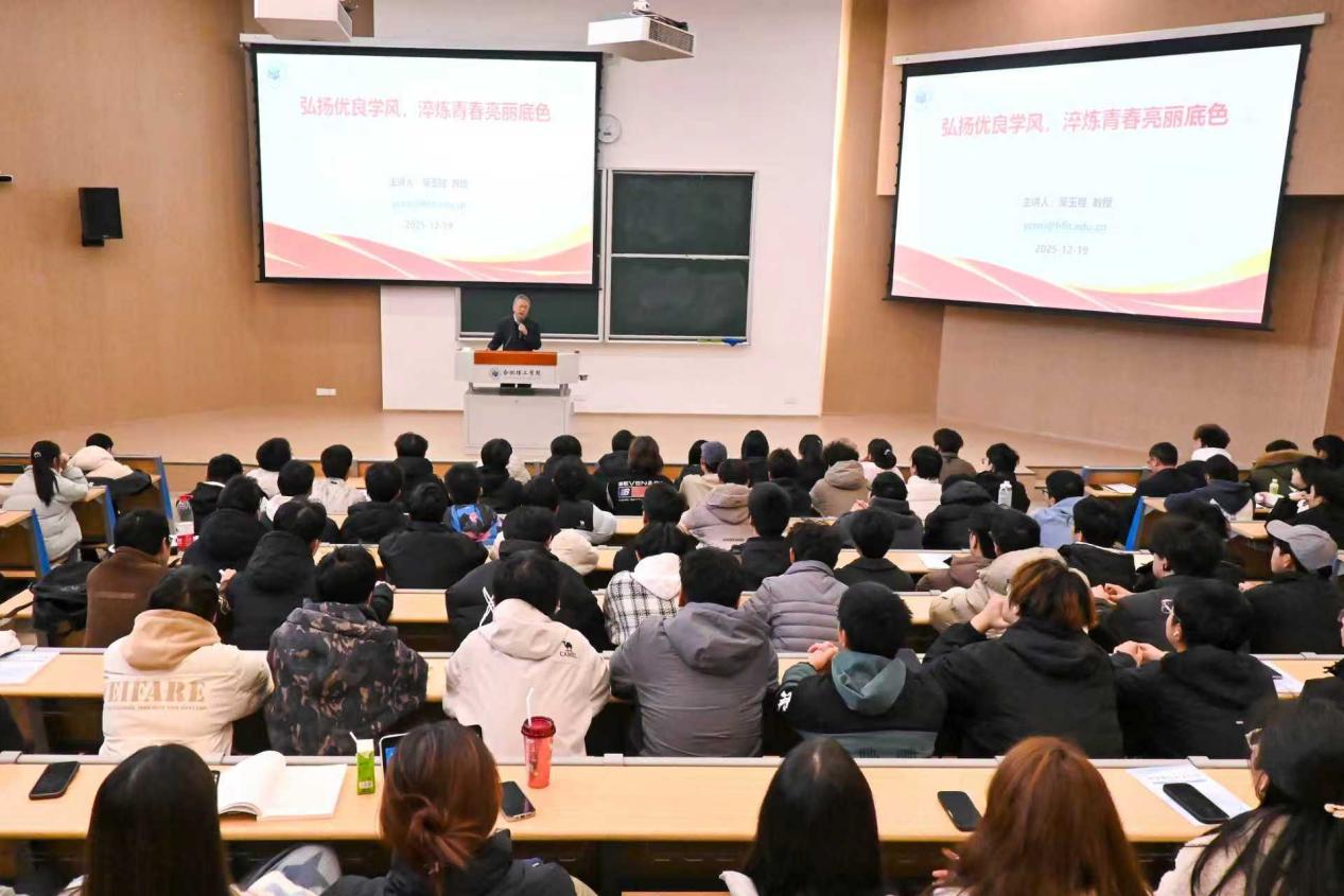 为深入贯彻落实习近平总书记关于思政课建设的重要指示精神,扎实推进立德树人根本任务,12月19日下午,校党委副书记、校长吴玉程走进课堂,以《弘扬优良学风淬炼青春亮丽底色》为题,为100余名2025级学生代表讲授了一堂兼具政治高度、理论深度、视野宽度、情感温度的思政课。