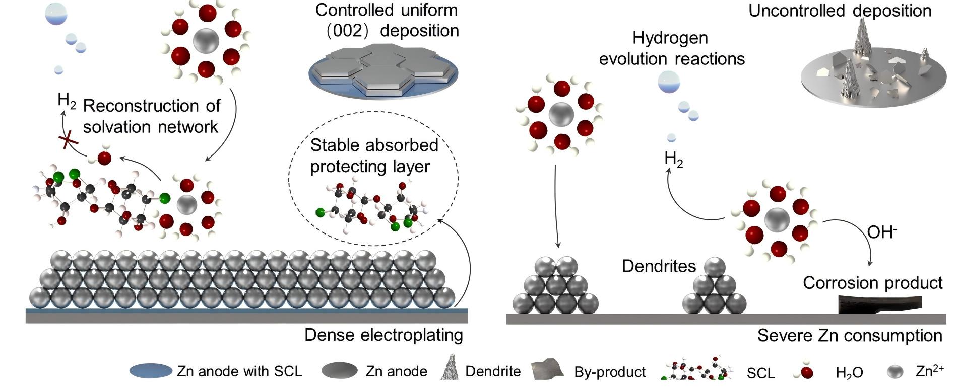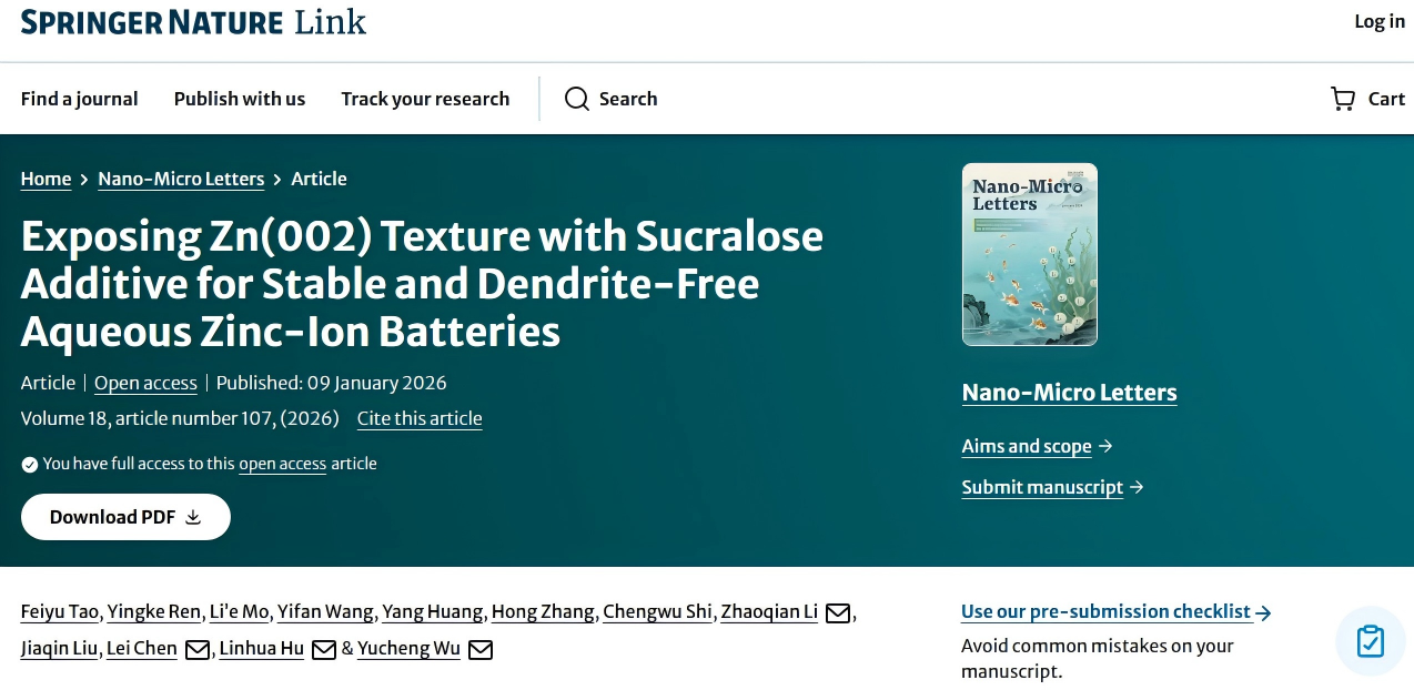 近日,pp电子校长吴玉程教授团队李兆乾副研究员在水系锌离子电池电解液研究方面取得新进展。研究人员在水系锌盐电解液中引入三氯蔗糖,实现锌(002)面择优取向生长,有效抑制了锌枝晶生长,极大提升了电池充放电可逆性和循环稳定性能。相关成果发表在国际期刊Nano-Micro Letters(2024年影响因子IF=36.3)。