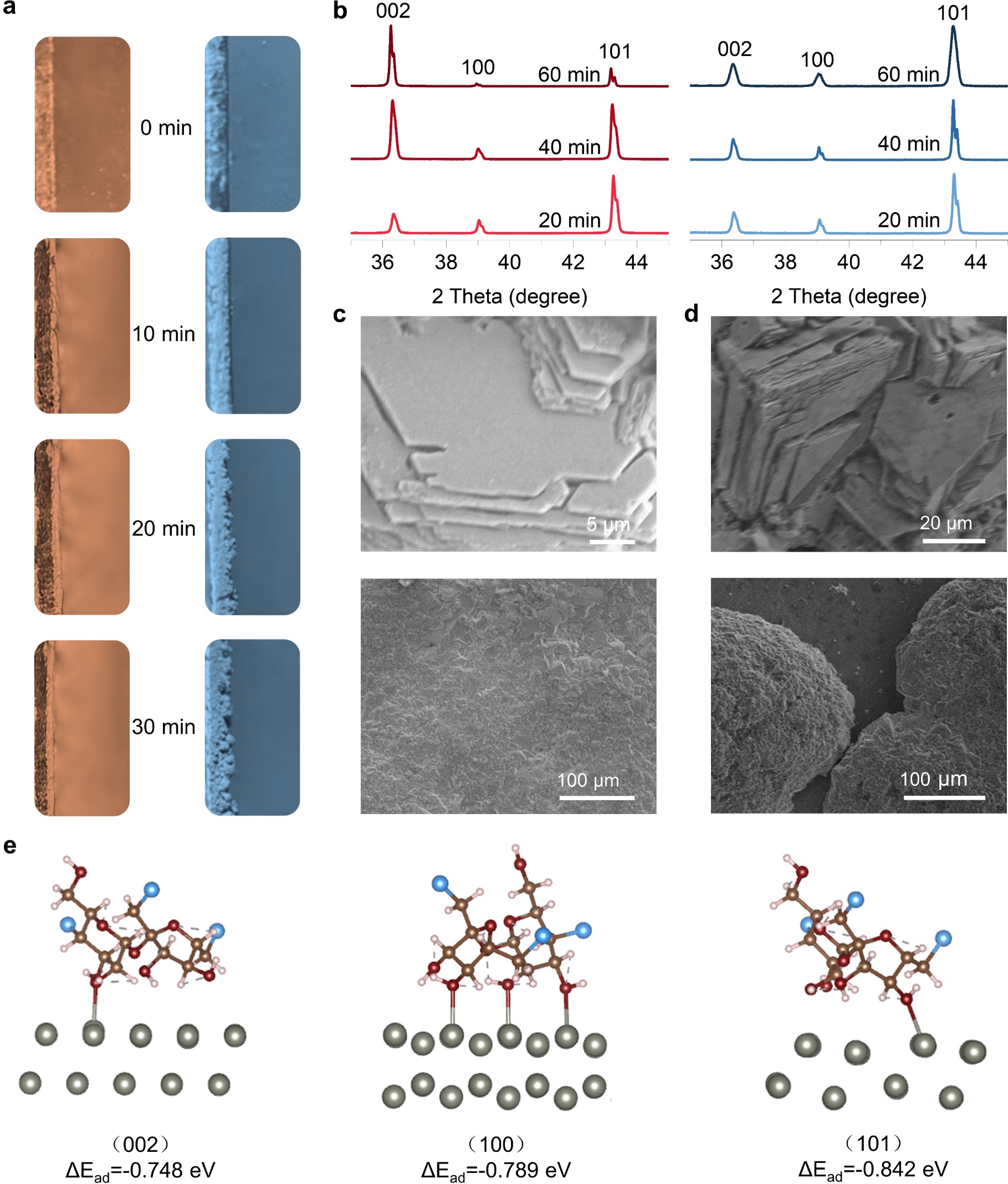 图2.在30 mA cm-2电流密度的条件下使用SCL/Zn(OTF)2(左)和Zn(OTF)2(右)电解液b锌沉积的原位光学显微镜图片。b锌片在30 mA cm-2电流密度的条件下使用SCL/Zn(OTF)2(左)和Zn(OTF)2(右)电解液沉积不同时间的XRD图谱。c锌片在在30 mA cm-2电流密度的条件下使用SCL/Zn(OTF)2和dZn(OTF)2电解液沉积的SEM图像。eSCL吸附在Zn晶面后,Zn离子在不同晶面上的吸附能。