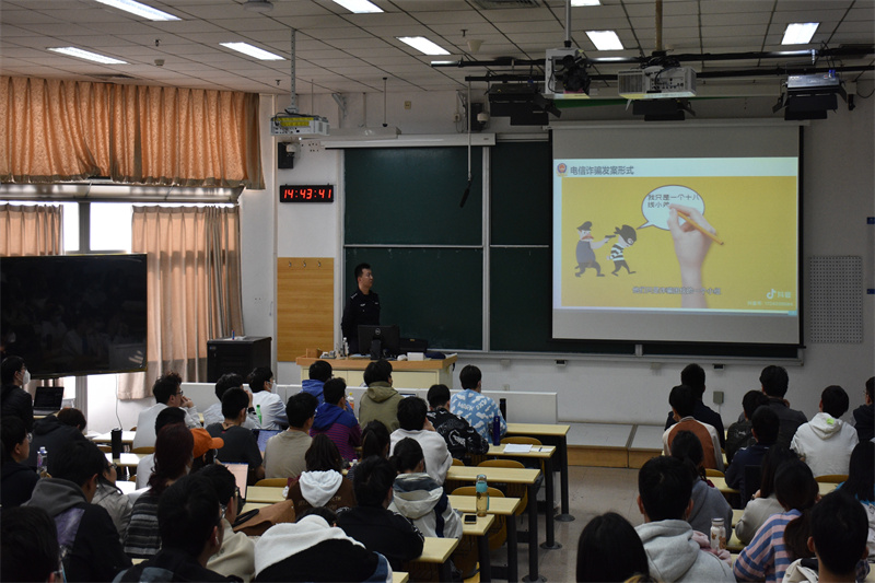 张警官从我校西土城路校区及周边区域近四年来的电信诈骗案例切入,通过一系列数字让同学们了解到电信诈骗就发生在身边。接下来,张警官向同学们介绍了新型电信网络诈骗类型的本质及特点,盘点隐藏在诈骗套路背后的“心理学”,深化了同学们对于新型诈骗的认识。随后,张警官利用图文视频生动地给同学们还原了案发过程,讲解了冒充公检法、刷单兼职、贷款、裸聊等诈骗陷阱。最后,张警官推介了“国家反诈中心”APP,提醒同学们在日常生活中要提高警惕,做到“不听、不信、不转账”。随后,闫老师分享了近日发生在身边的拉群“发红包”的诈骗案例。